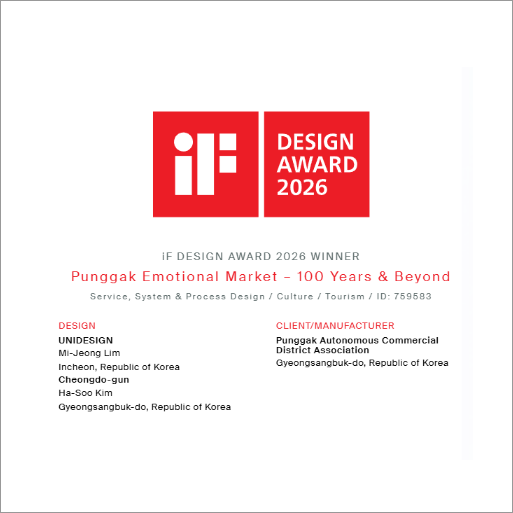 전년도에 자사가 청도군청과 풍각상인.주민회와 컨소시엄으로 과기부 공모사업에 신청, 선정되어서 진행했던 '청도군 풍각장일원 상권활성화 사업'이 독일 iF DESIGN AWARD 2026에 선정되었다. 소상공인시장진흥공단이 주관기관으로 하는 2025 동네상권발전소 사업'의 일환으로,  지난 9월에 출품하였고, 12월에 예선통과를 거쳐 2026년 2월 24일에 최종 수상이 확정되었다. 시상식은 2026년 4월 27일 베를린에서 시행한다.